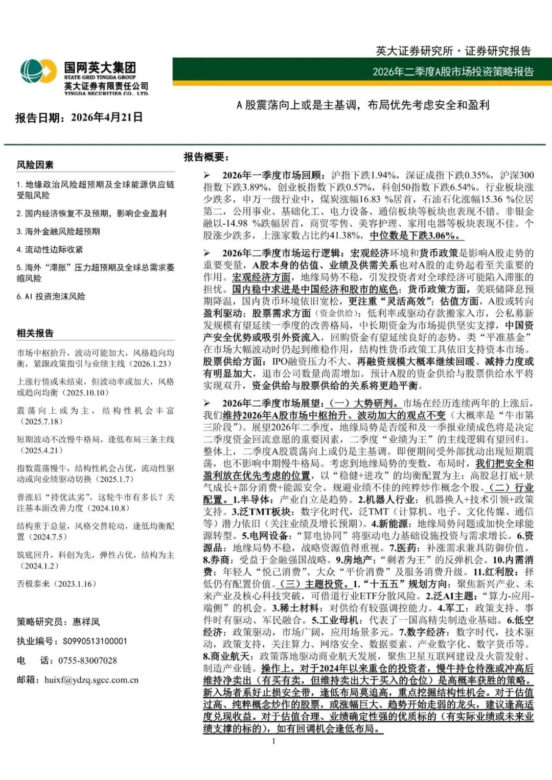 回复暗号:2026年二季度A股市场投资策略报告:A股震荡向上或是主基调,布局优先考虑安全和盈利-260421-英大证券-74页
