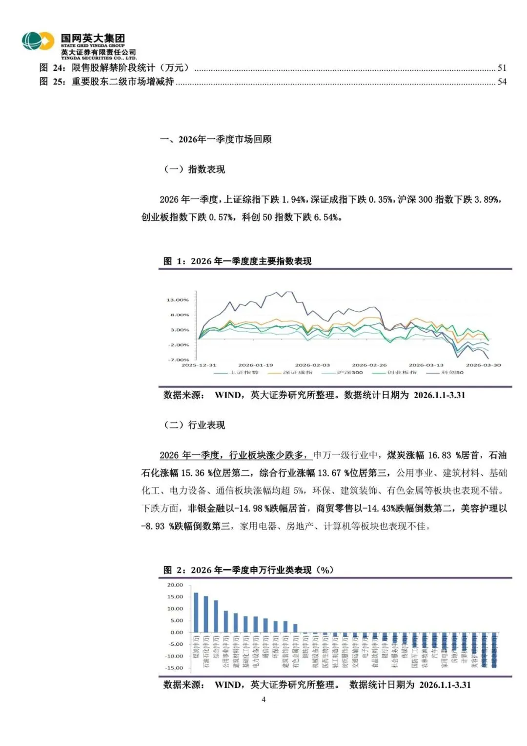 2026年一季度市场回顾:沪指下跌1.94%,深证成指下跌0.35%,沪深300指数下跌3.89%,创业板指数下跌0.57%,科创50指数下跌6.54%。行业板块涨少跌多,申万一级行业中,煤炭涨幅16.83 %居首,石油石化涨幅15.36 %位居第二,公用事业、基础化工、电力设备、通信板块等板块也表现不错。非银金融以-14.98 %跌幅居首,商贸零售、美容护理、家用电器等板块表现不佳。个股涨少跌多,上涨家数占比约41.38%,中位数是下跌3.06%。