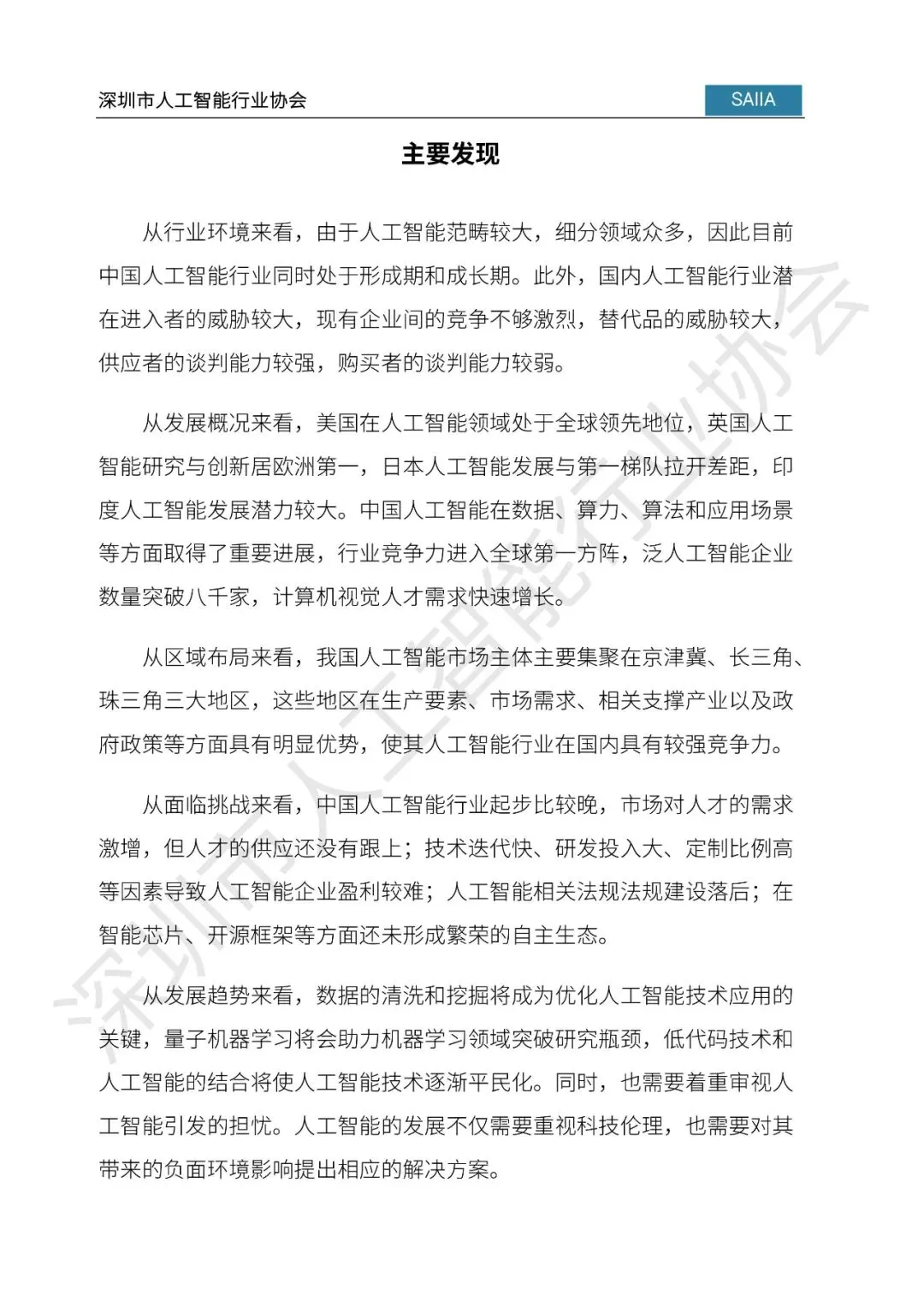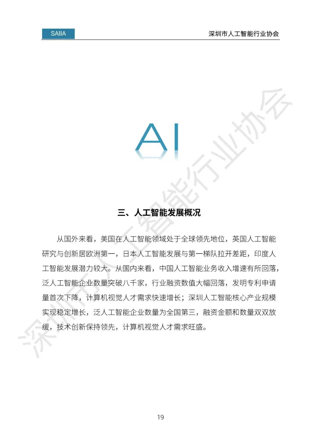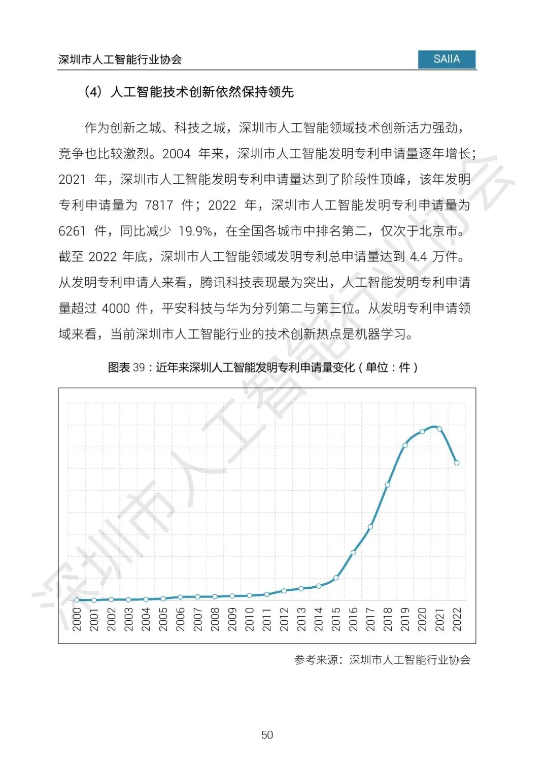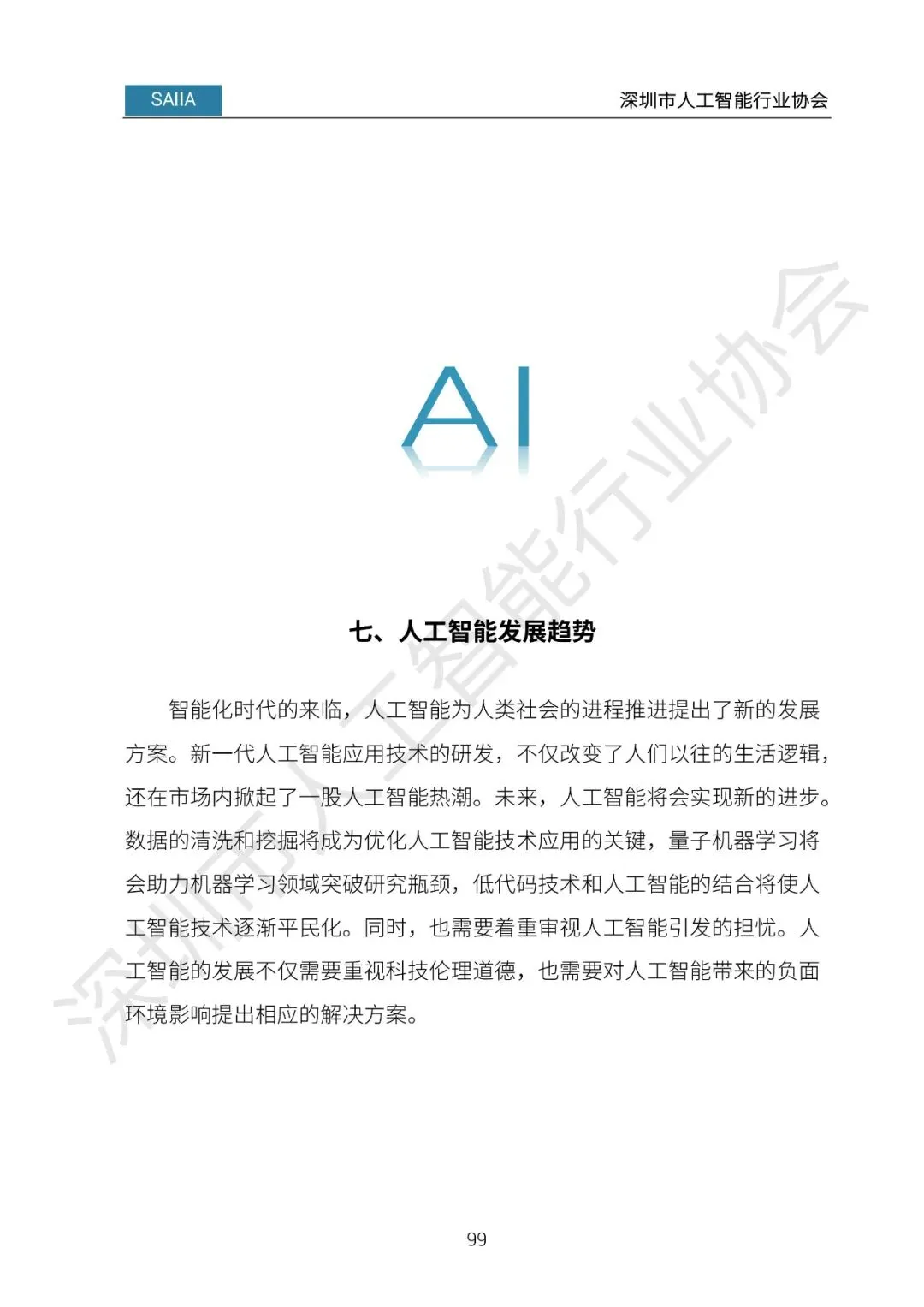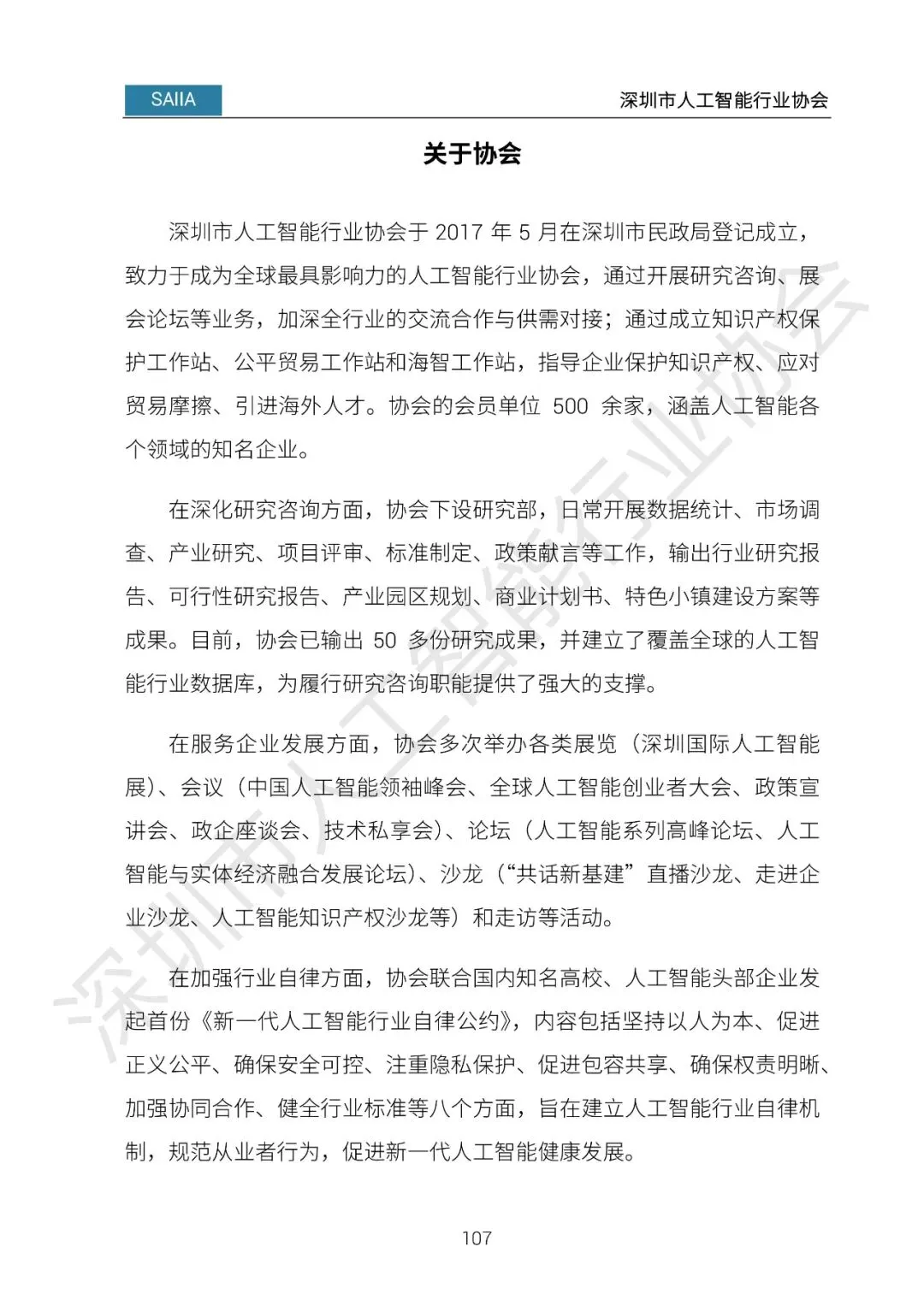 深圳市人工智能行业协会作为全国首家专注于人工智能领域的行业协会,具有行业统计、研究、咨询等职能,致力于提供高水平的智库服务。为紧跟时代步伐,响应国家战略,深圳市人工智能行业协会发挥行业统计、研究职能,就人工智能产业链、发展概况、产业集群、应用场景、面临挑战以及发展趋势等方面进行深入研究,形成了《2023人工智能发展白皮书》。