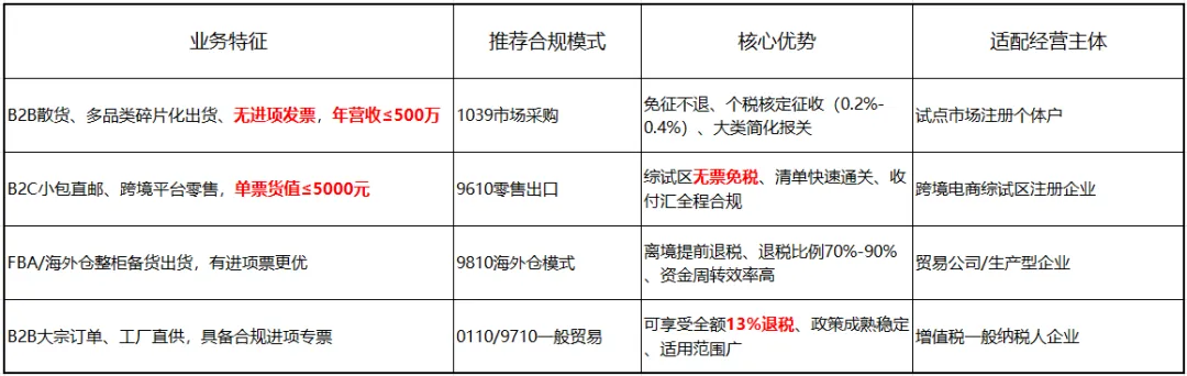 无进项发票、多品类散单经营、无FBA海外仓布局的中小卖家,1039市场采购为最优转型路径;以B2C小包直邮为主、有平台交易数据背书的卖家,优先选择9610零售出口合规通道。