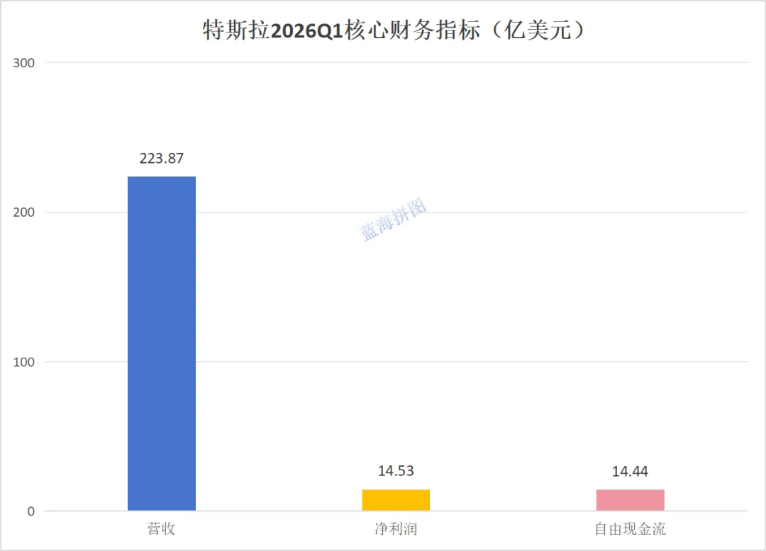 2026年第一季度,特斯拉实现营收223.87亿美元,同比增长16%;调整后净利润14.53亿美元,同比增长56%;自由现金流14.44亿美元,同比增长117%。
