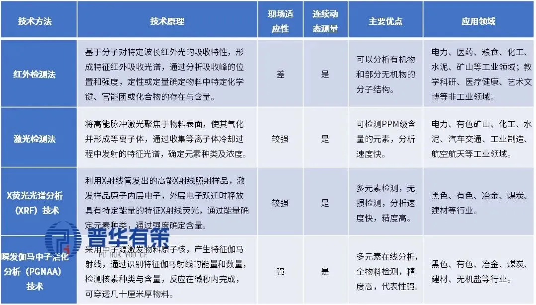 主要包括瞬发伽马中子活化(PGNAA)、X荧光光谱(XRF)、激光诱导击穿光谱(LIBS)和红外光谱(IR)等技术,均属非接触式检测,通过分析物质与激发源作用后的特征信息实现元素或分子结构的定性定量分析。