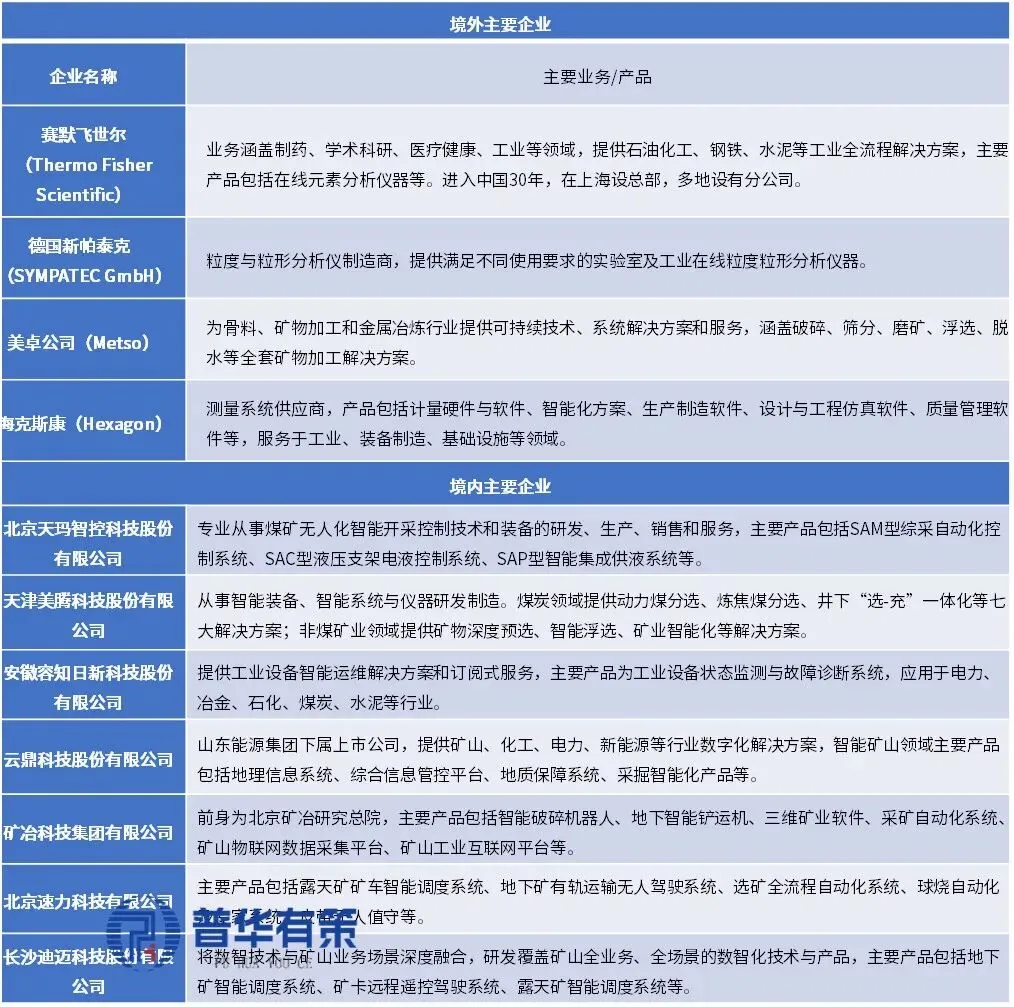 海外智能矿山建设起步早,美、加、瑞典、芬等国企业自20世纪90年代起研发智能开采技术,已实现遥控采矿、无人工作面等,先发优势明显。主要企业包括赛默飞世尔(ThermoFisherScientific)、德国新帕泰克(SYMPATECGmbH)、美卓公司(Metso)、海克斯康(Hexagon)等。