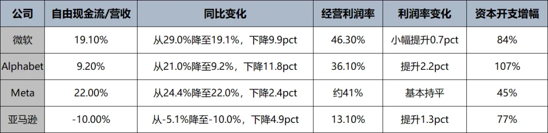 营收 1815.19 亿美元,同比增长 17%(预期约 1772–1773 亿美元);经营利润 238.52 亿美元(预期约 208–209 亿美元);经营利润率 13.1%(按预期经营利润/预期营收倒算约 11.8%)。现金资本开支约 432–442 亿美元,同比增长约 76%–77%;过去 12 个月自由现金流从去年同期 259 亿美元 降至约 12 亿美元