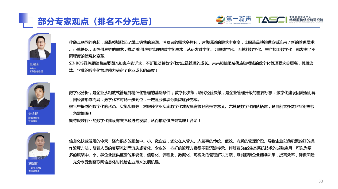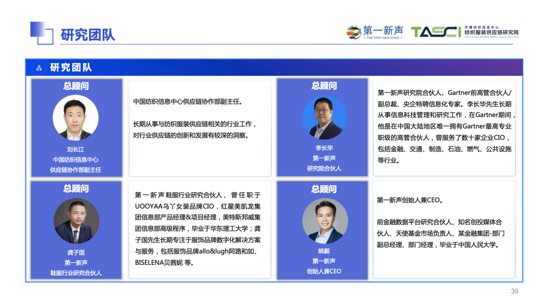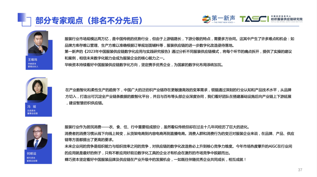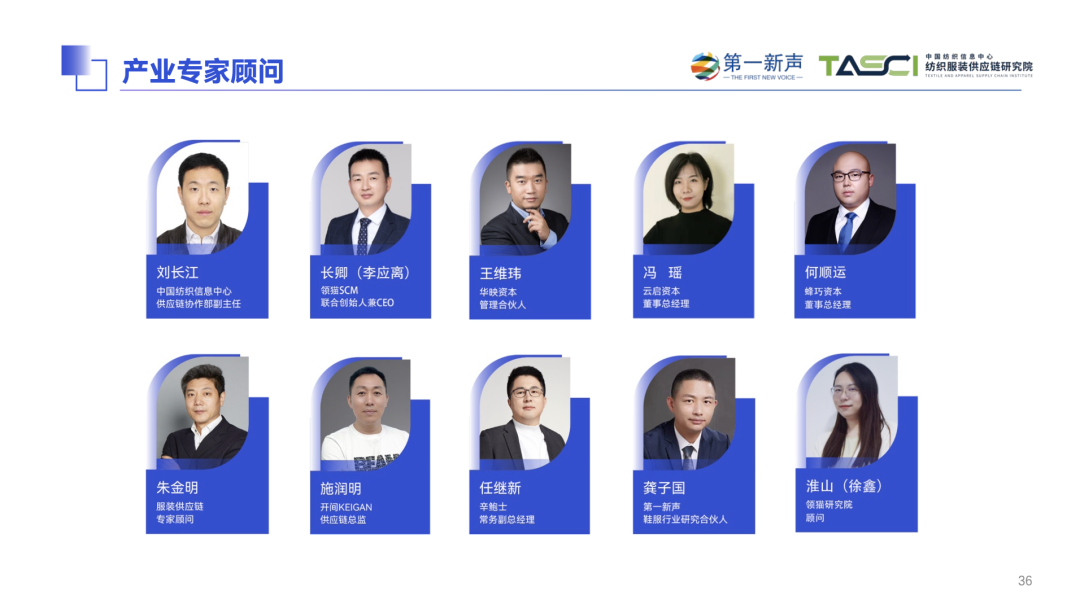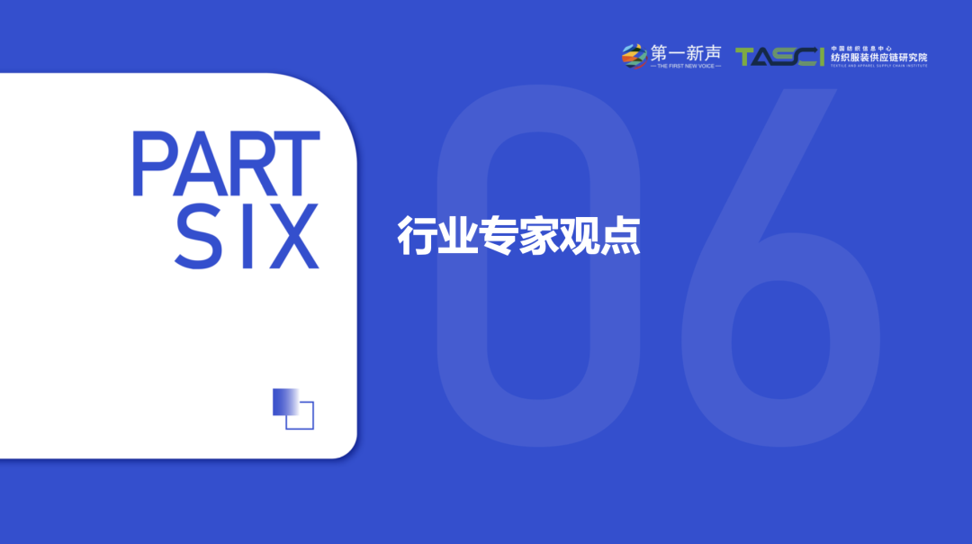 在调研期间,第一新声收到了大量企业/专家的问卷、反馈、访谈、建议和支持,在这里重点感谢以下部分公司和投资机构:YAYA鸭鸭、辛鲍士、开间KEIGAN、马骑顿、卓尚服饰、乌丫、海明控股集团、华映资本、云启资本、蜂巧资本、多位服装供应链专家顾问及非公开高管的大力支持。