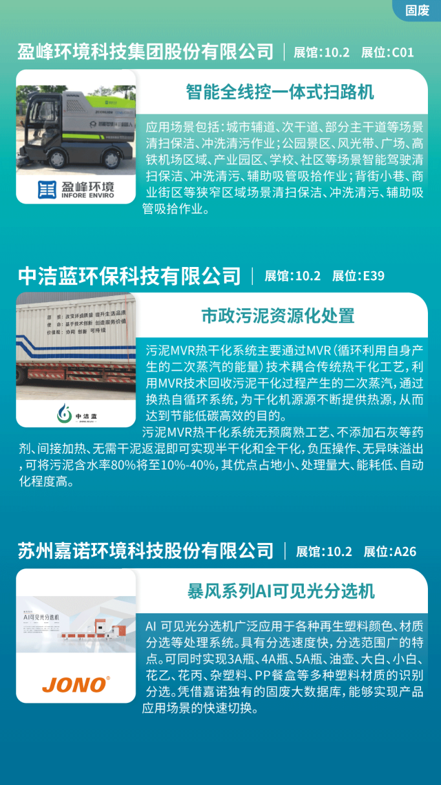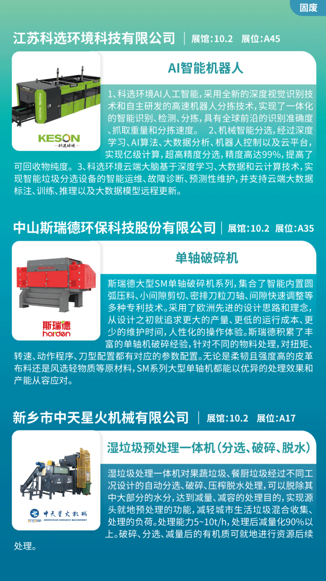污泥处置、分选机、垃圾焚烧、餐厨垃圾处理、垃圾渗滤液、垃圾分选机、破碎机、脱水机、湿垃圾处理一体机、AI智能机器人、环卫车辆、智能垃圾桶、畜禽废弃物处置等。