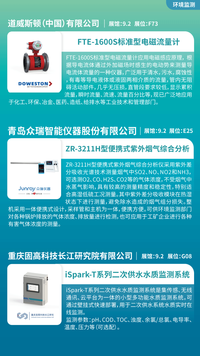 传感器、水质检测系统、土壤重金属分析仪、烟气排放监测系统、电磁流量计、智慧AI监控系统、便携式有毒挥发气体分析仪、粉尘浓度测量仪、噪声在线监测系统等。