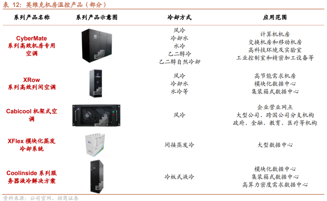 机房温控产品类型齐全,涵盖风冷、水冷、间接蒸发冷、液冷等多种冷却方案。公司自成立以来便深耕于机房温控节能设备领域,截至目前已经形成CyberMate系列机房专用空调、XRow系列高效列间空调、iFreecooling自然冷却双循环机组、XFlex模块化蒸发冷却系统、Coolinside服务器液冷解决方案等多系列产品,涵盖风冷、水冷、间接蒸发冷、液冷等多种冷却方案,可应用于大型、超大规模数据中心、模块化数据中心、企业、政府、金融网点、核心CBD、教育系统、公安系统等多种场景。
