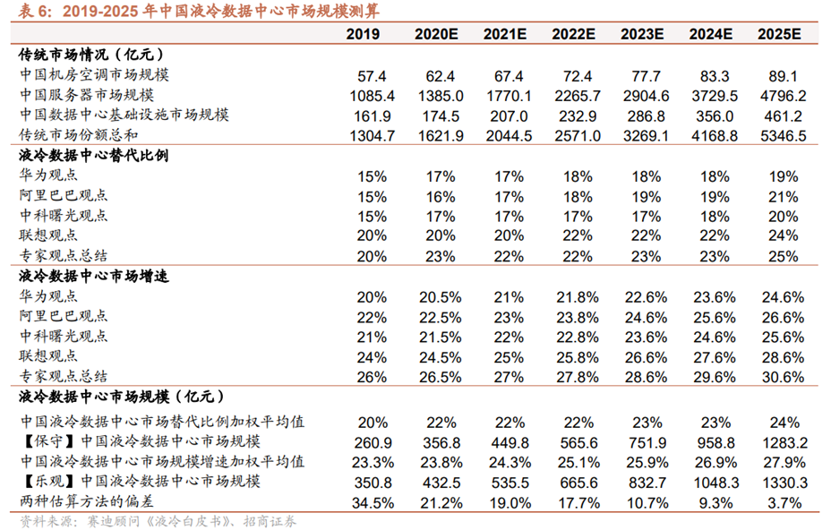 预计2025年中国液冷数据中心市场规模将超千亿。据《液冷白皮书》,考虑到液冷对传统市场进行替代,包括风冷的机房空调市场、服务器市场以及数据中心基础设施(机柜、CDU、冷却塔等)市场,预计2025年,保守测算下中国液冷数据中心市场规模将达1283.2亿元,乐观测算下中国液冷数据中心市场规模将达1330.3亿元。