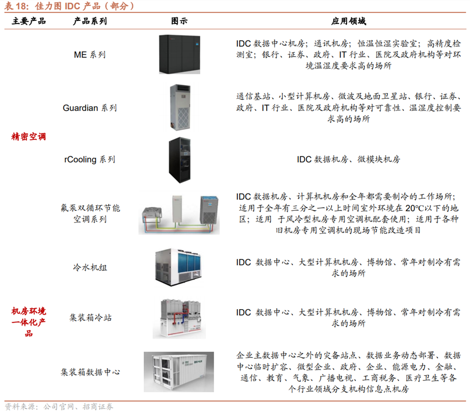 发展战略向一体化解决方案服务商转变,产品线覆盖超级计算机、数据中心、户外机柜等多种环境需求。公司目前形成了包括风冷直膨氟泵系统、风冷冷冻水系统、水冷冷冻水系统、间接蒸发冷系统、智能冷站解决方案等在内的水机+末端+RDS系统的一体化数据中心解决方案,降低机房能耗,打造高效节能的数据中心。此外,公司自研的中温和低温环境恒温恒湿技术的精密空调,已应用于图书场馆、博物场馆、高档酒类储藏室、实验室等智能建筑的环境控制领域。尤其节能显著的氟泵机组以及配带自由冷却的设备备受市场关注。