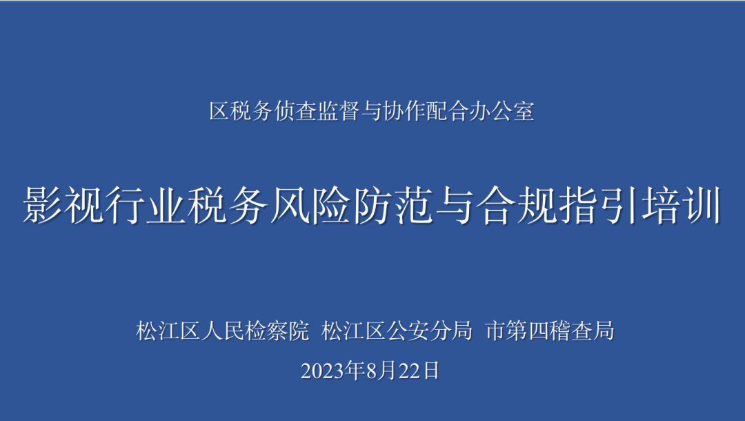 为深入推进企业合规改革,助力优化法治化营商环境,为企业注入“法治血液”,提高影视企业防范和化解法律风险能力。8月22日下午,上海市松江区人民检察院联合上海市公安局松江分局、上海市税务局第四稽查局走进上海仓城影视文化产业园,开展“影视行业税务风险防范与合规指引”培训活动,邀请了园区管理人员、上海仓城文化创意发展有限公司招商人员、影视企业财会人员、代理记账人员等。