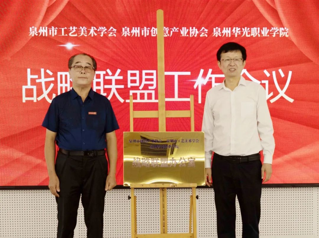 8月25日,泉州市创意产业协会&泉州市工艺美术学会&泉州华光职业学院战略联盟第一次联席会议在泉州华光职业学院图书馆一楼多功能厅顺利召开。泉州市创意产业协会会长、泉州华光职业学院董事长吴其萃,泉州工艺美术学会会长邱少煌以及两会部分副会长、理事参加了会议。会上举行了联盟揭牌仪式,明确了“泉州市创意产业协会&泉州市工艺美术学会&泉州华光职业学院战略联盟”关系,成立了联盟办公室。