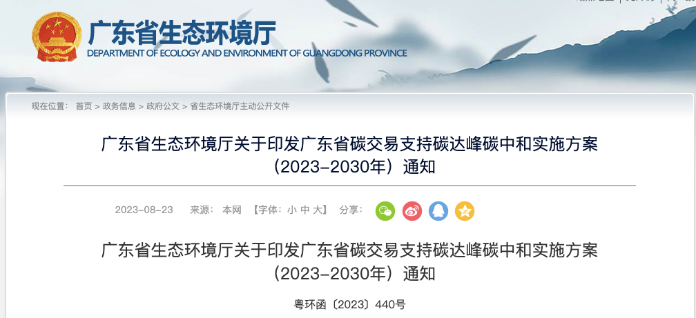 8月22日,广东省生态环境厅印发《广东省碳交易支持碳达峰碳中和实施方案(2023-2030年)》。《方案》指出: