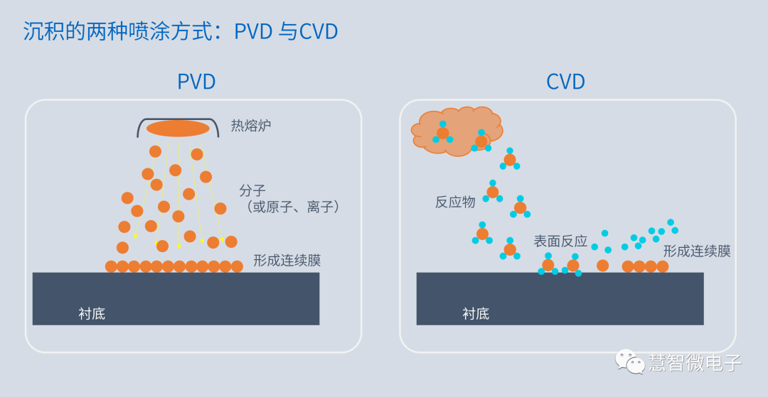 图:薄膜沉积中的两种工艺:PVD与CVD