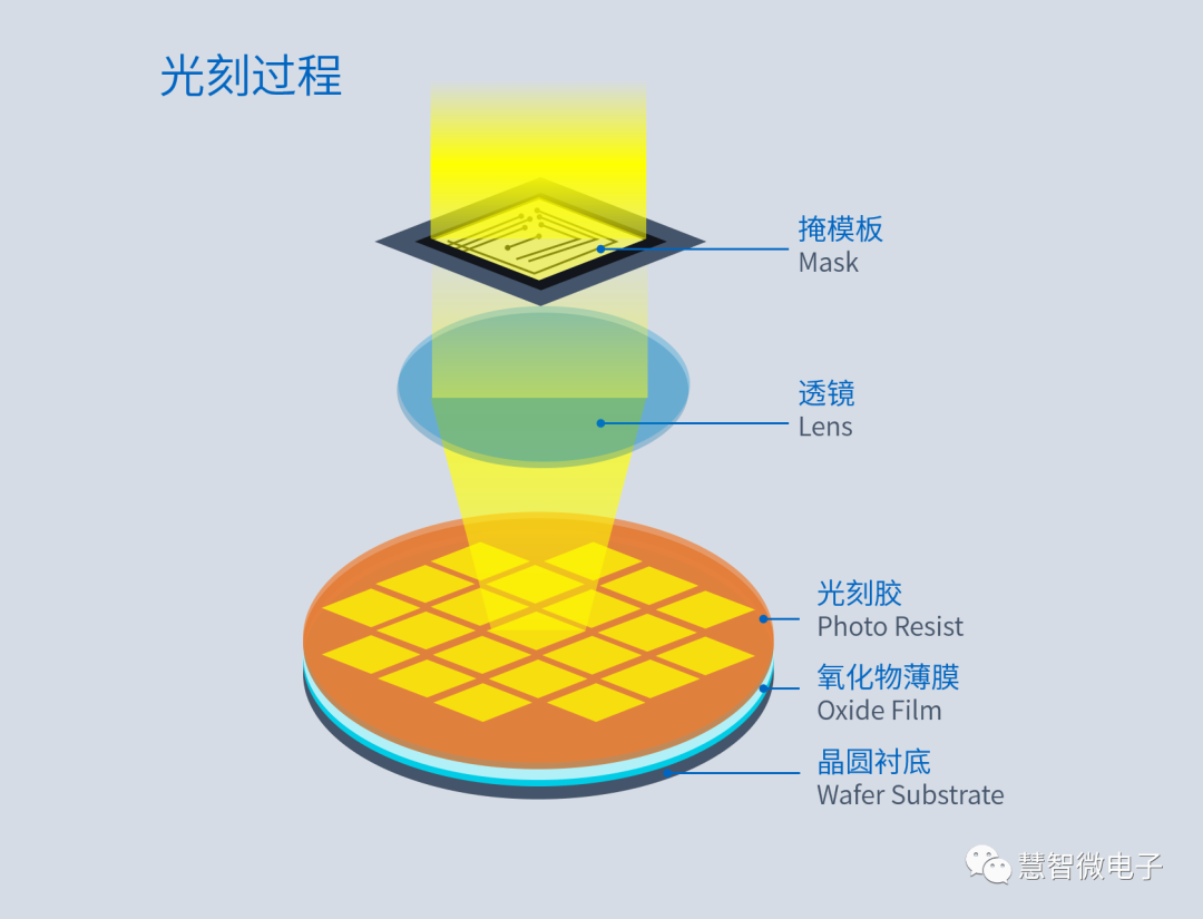 曝光。将光源发出的光线经过掩模板照射到晶圆片上时,掩模板上的图形也就被转移到了晶圆片上。根据掩模板上图形的不同,光刻胶会溶解形成对应图形。