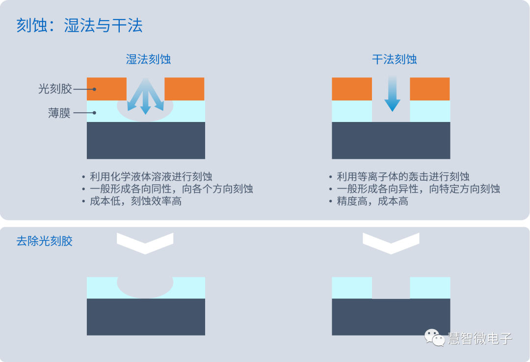 光刻之所以得名,就是因为它通过利用光线,把带有图案的掩模板上的图形转移到晶圆片上。由于半导体技术的主要目标是尽可能的缩小电路尺寸,所以对光刻的精度要求也越来越高。高精度的光刻机是光刻步骤的基础,这就是为什么“光刻”成为备受关注的工艺步骤。为了支持更高精度的光刻,也有先进的光刻机被制造出来。目前最先进的光刻机技术是极紫外光刻技术(EUV,Extreme Ultra-violet),它使用波长为13.5纳米的极紫外线作为光源进行电路光刻,可以制造出7纳米及以下工艺节点的芯片。ASML是EUV光刻机的领导厂商,其最新型号的光刻机号称可实现0.3纳米的精度。光刻技术是半导体芯片工艺中最昂贵的工艺,在先进工艺中,光刻步骤的成本可以占整个芯片加工成本的三分之一甚至更多。经过了光刻步骤之后,所需要的图案已经被印在了晶圆表面的光刻胶上。但要实现半导体器件的制作,还需要把半导体器件按照光刻胶的图形复刻出来。这个复刻的过程就叫刻蚀(Etching)。半导体刻蚀方法分为两类,分别是湿法刻蚀和干法刻蚀。湿法刻蚀是将晶圆片浸入到含有特定化学剂的液体溶液中,利用化学反应来溶解掉未被光刻胶保护的半导体结构。由于液体化学品不能很好的控制方向性,所以可能会导致刻蚀不均匀,造成刻蚀的不足或过度;另外,由于液体化学品会残留在晶圆上,所以需要额外的清洗步骤来去除污染物。干法刻蚀是用等离子体或者离子束等来对晶圆片进行轰击将未被保护的半导体结构进行去除的方法。相比于湿法刻蚀,干法刻蚀精度高、选择性和方向性好,并且不会产生残留物,适用于制造高集成度的芯片。然后干法刻蚀也有缺点,例如成本高,设备复杂,处理时间长。在半导体工艺步骤中,会根据不同的目标和需求,灵活选择最适合的工艺。甚至在同一个器件制作的不同步骤中,会混合使用湿法刻蚀和干法刻蚀。通过光刻及刻蚀步骤,就可以将希望的图形,在晶圆片上真正实现。需要说明的是,光刻/蚀刻步骤一次只能实现一层半导体结构,由于半导体器件是多层器件, 通过需要迭代多次才能将半导体器件完整蚀刻出来。并且随着工艺复杂度的不同,需要的层数也不同。例如在0.18微米的CMOS工艺中,需要的光罩层数约为20层,而对于7nm左右的CMOS工艺来说,则需要55-60层[3]。如果说以上工艺步骤是任何微机械器件都必须要考虑的工艺的话,那么“掺杂工艺”(Doping)就是半导体工艺中的灵魂工艺了。说掺杂工艺是半导体工艺中的灵魂工艺,是因为电路中各半导体器件的电学性能在此步骤形成。在此步骤之前,整片晶圆不过是一片冷冰冰的材料一片,过了此步骤,才有了各种各样的二极管、三极管、CMOS以及电阻等。掺杂工艺在半导体中如此重要,是因为它可以改变半导体的电导率、载流子类型和浓度、能带结构等电学性质,从而实现不同的功能和性能。半导体的导电性能可控,就是通过掺杂来实现。