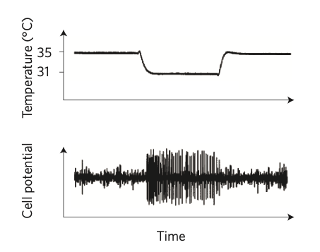 首先来认识一下人类皮肤的各种感受器,人类皮肤的感受器主要可分为七类:痛觉、冷觉、热觉以及四种机械感受器。冷觉、热觉的感受器在无害的温度范围下,可感知到~5到48 °C 的温度。这些感受器给讯息编码的方式如下图,是以动作电位的变化来认知的。