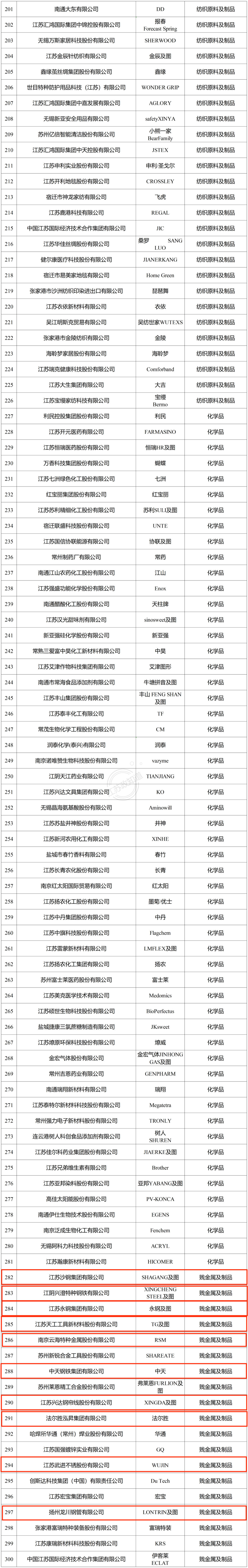 江苏永钢集团有限公司、江苏天工工具新材料股份有限公司、南京云海特种金属股份有限公司、中天钢铁集团有限公司、江苏兴达钢帘线股份有限公司、法尔胜泓昇集团有限公司、江苏武进不锈股份有限公司、扬州龙川钢管有限公司、江苏常宝钢管股份有限公司、
