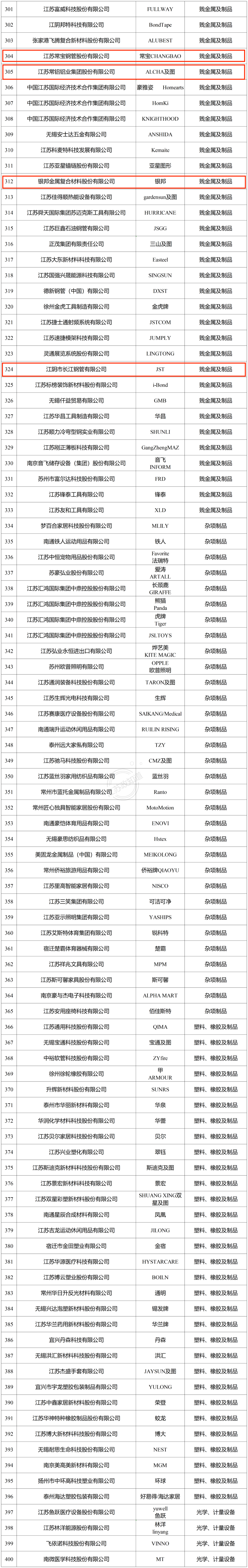 江苏常铝铝业集团股份有限公司、银邦金属复合材股份有限公司、江阴市长江钢管有限公司等多家冶金企业入选。