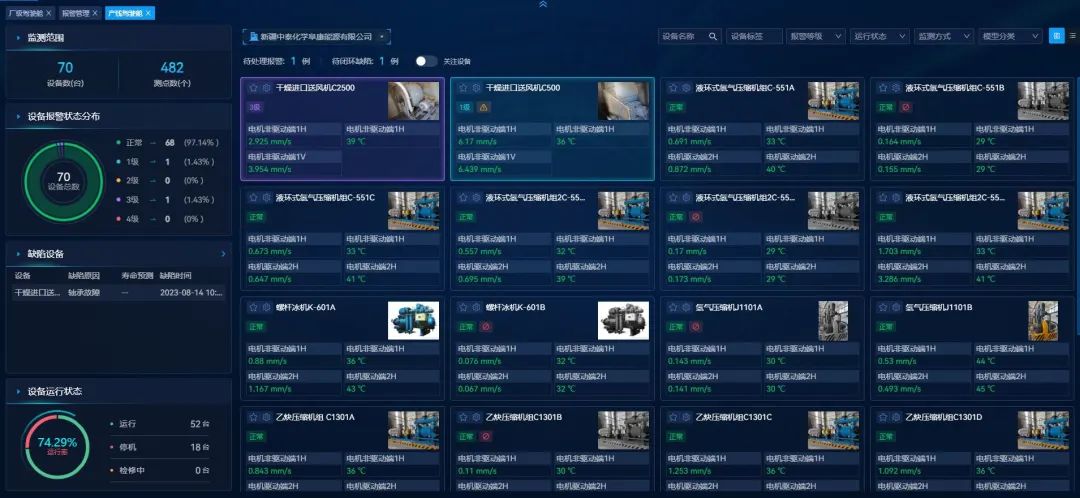 近年来,随着物联网、大数据技术在智慧工厂中的逐步发展和应用,为阜康能源设备状态在线监测及诊断分析提供了技术基础。目前,阜康能源有100台大型机组实现在线监测及诊断分析,能及时有效发现运行异常并进行处理。