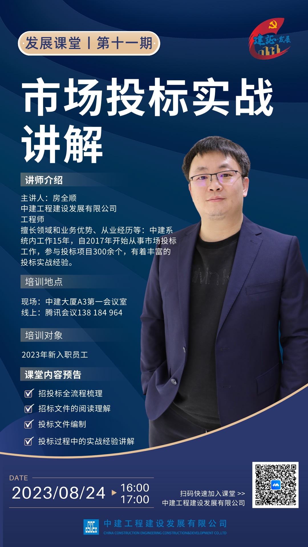 2023年,中建工程建设发展有限公司以习近平新时代中国特色社会主义思想为指导,全面贯彻落实党的二十大精神,按照中建集团党组及中建设计研究院党委的部署要求,紧坚持“人才是第一资源”,持续打造和提升人才的政治力、领导力、专业力和职业力。依托“建证·发展”党建载体,成立“发展课堂”,紧紧围绕中心工作,以“内培+外培”方式全方位、多领域给全体员工内训,以高质量人才培养建设服务企业高质量发展。