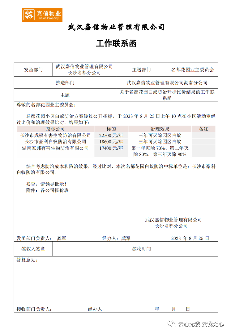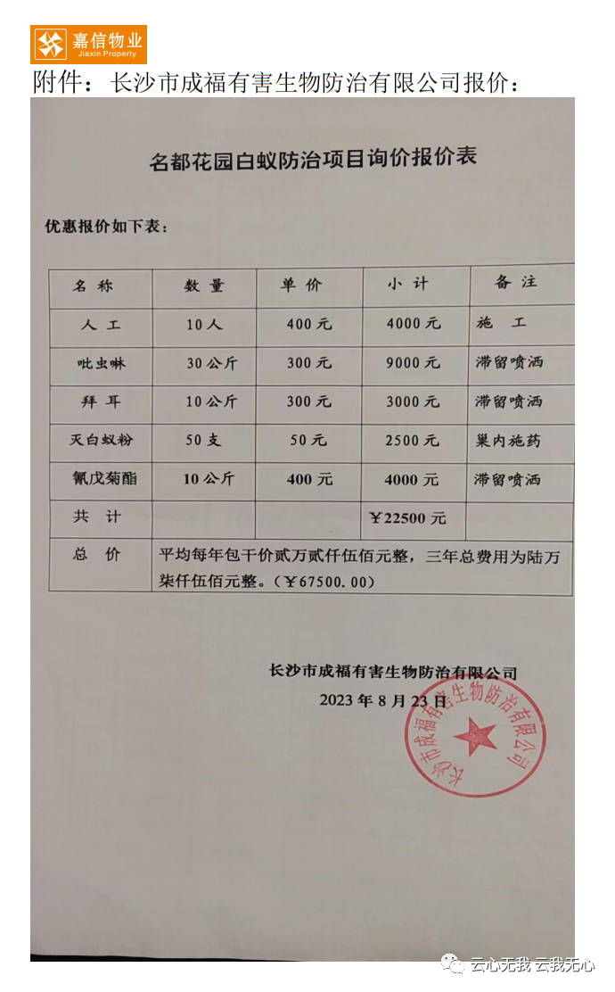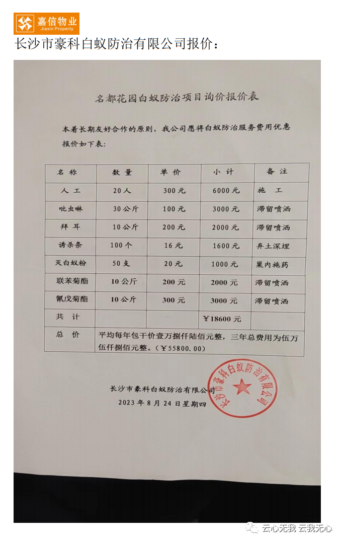 2023年8月25日上午10点,在小区18栋D座一楼业主活动室开标。今日物业公司发来小区白蚁防治招标结果(附后),综合考虑防治成本和防治效果,经过比对,本次名都花园白蚁防治中标单位是:长沙市豪科白蚁防治有限公司。