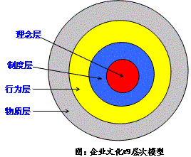 综合国内外各种定义和经验,企业文化主要分为四个层次,包括:理念层、制度层、行为层和物质层,根据分层,建立的四层同心圆模型如下: