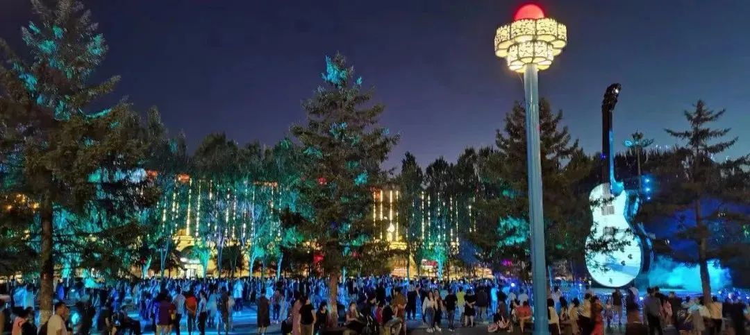 大吉他主题广场位于鸭绿江畔,在这里可以来观江景、看夜色、打卡灯光秀表演。