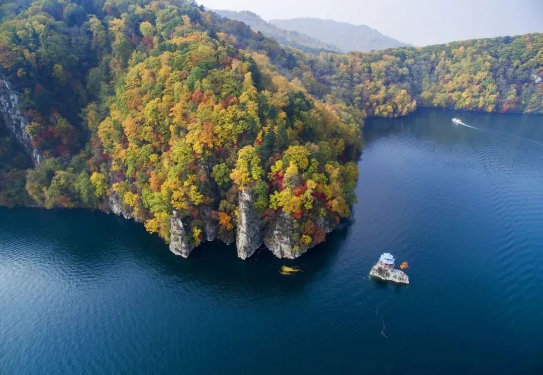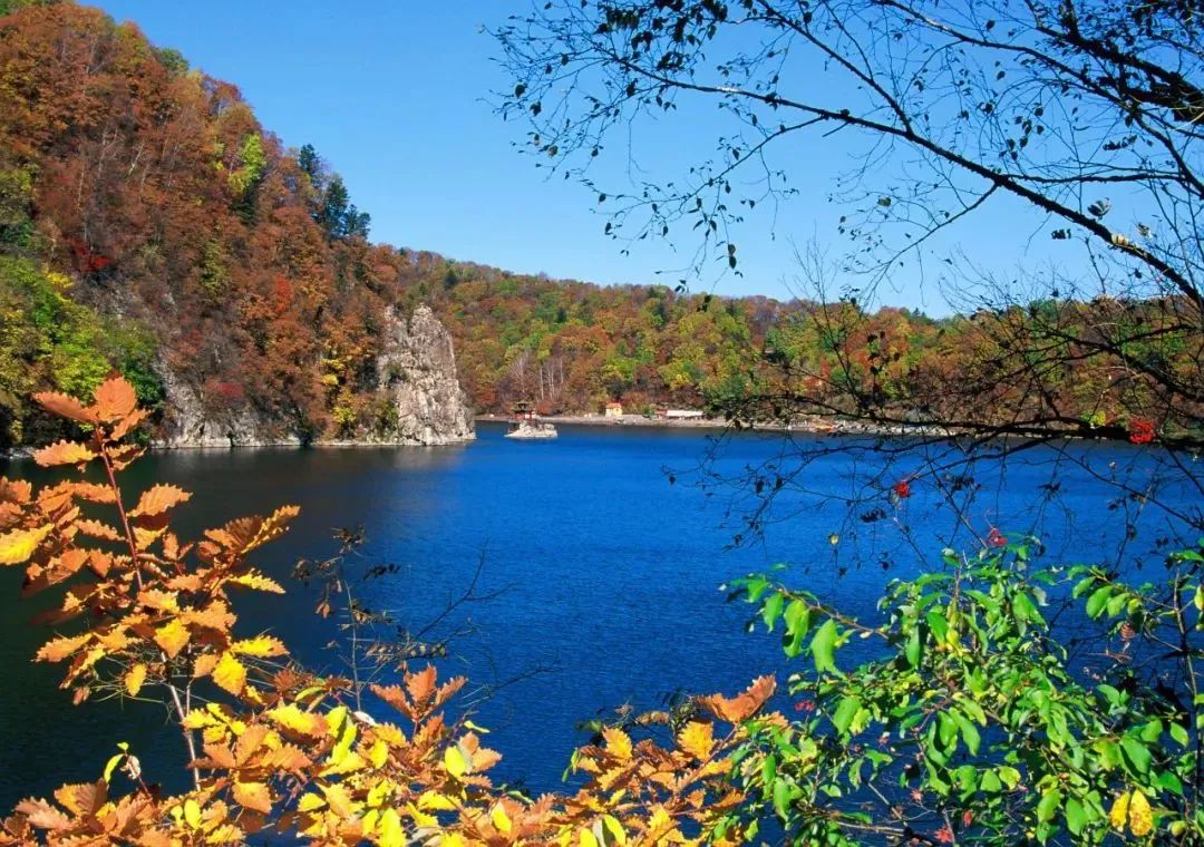 辉南十景中最著名的当属三角龙湾,因水面呈三角形,加之湖南侧矗立着30米高的三角石而得名。俯瞰全景,山如盘龙,湖如玉镜,泉水如涓,处处洋溢着大自然的青春活力。