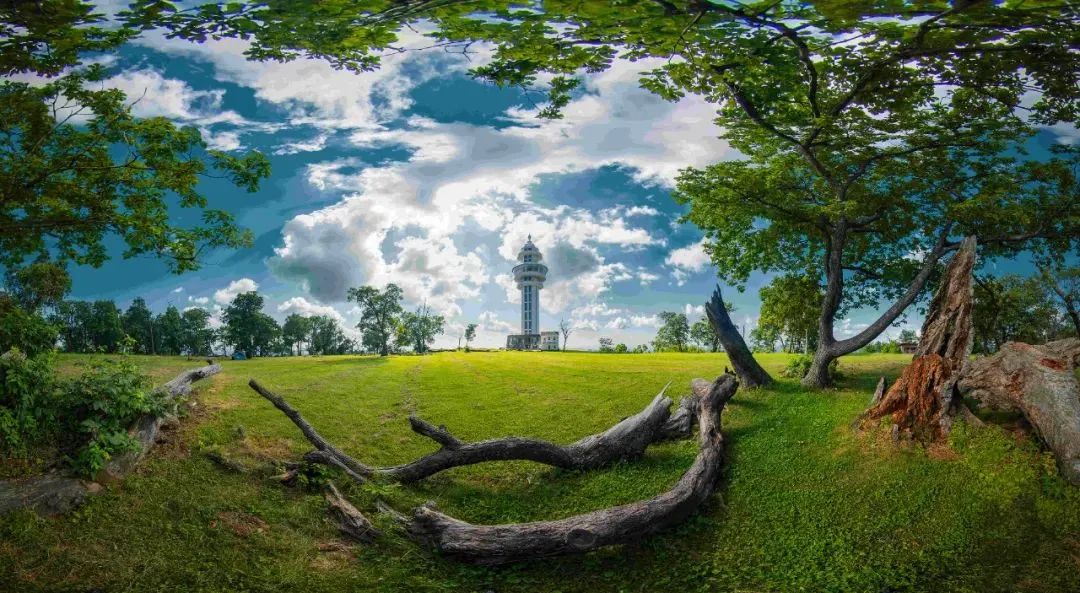 山顶建有一座62米高的防火瞭望塔,塔内设有观光电梯,游客可以到8层、9层瞭望平台,登高望远,一览众山,赏日出日落,观云海舒卷,悟自然妙化。