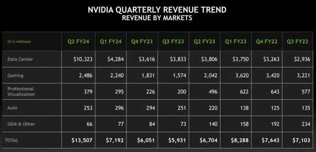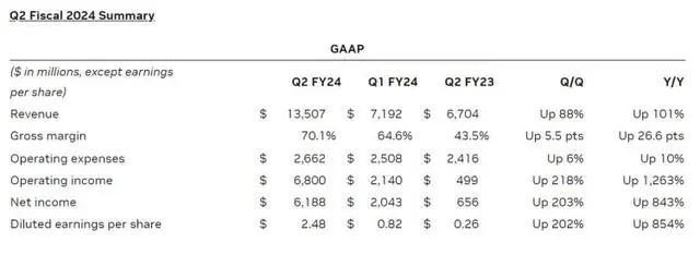 北京时间8月24日凌晨,英伟达发布了截至7月30日的2024财年第二财季财报。第二财季,英伟达营收135.07亿美元,同比增长101%,环比增长88%,创下历史新纪录;净利润61.88亿美元,同比增长843%,环比增长203%。