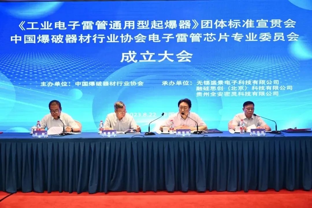 2023年8月22日,中国爆破器材行业协会(以下简称“中爆协”)在北京组织召开了《工业电子雷管通用型起爆器》团体标准宣贯会暨中国爆破器材行业协会电子雷管芯片专业委员会成立大会。工信部安全生产司民爆处处长鲍常科、中爆协理事长肖春泉、芯片专委会主任委员王忠茂出席会议并讲话,会议由中爆协副理事长兼秘书长王军主持。工信部安全生产司肖月华二级巡视员、卫水爱调研员、部分省级民爆行业主管部门、省级爆破器材行业协会相关领导,全体芯片专委会委员以及电子雷管生产企业集团和芯片生产企业有关代表共计170余人参加会议。