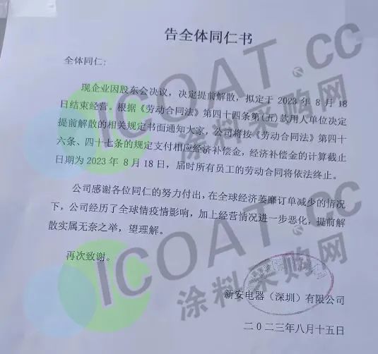 近日,又一下老牌电器厂传来噩耗,38年老牌港资大厂——新安电器(深圳)有限公司突然宣布解散。其发布的“告全体同仁书”显示,在全球经济萎靡订单减少的情况下,公司经历了全球疫情影响,加上经营情况进一步恶化,决定提前解散,