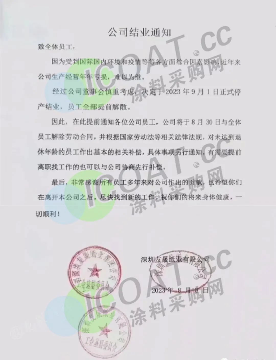 广东省某企业发布结业通知,称疫情三年使公司一路走来举步维艰,年年营业,年年亏损,现今熬过了疫情却没能扛住行业的风变,经研究决定,