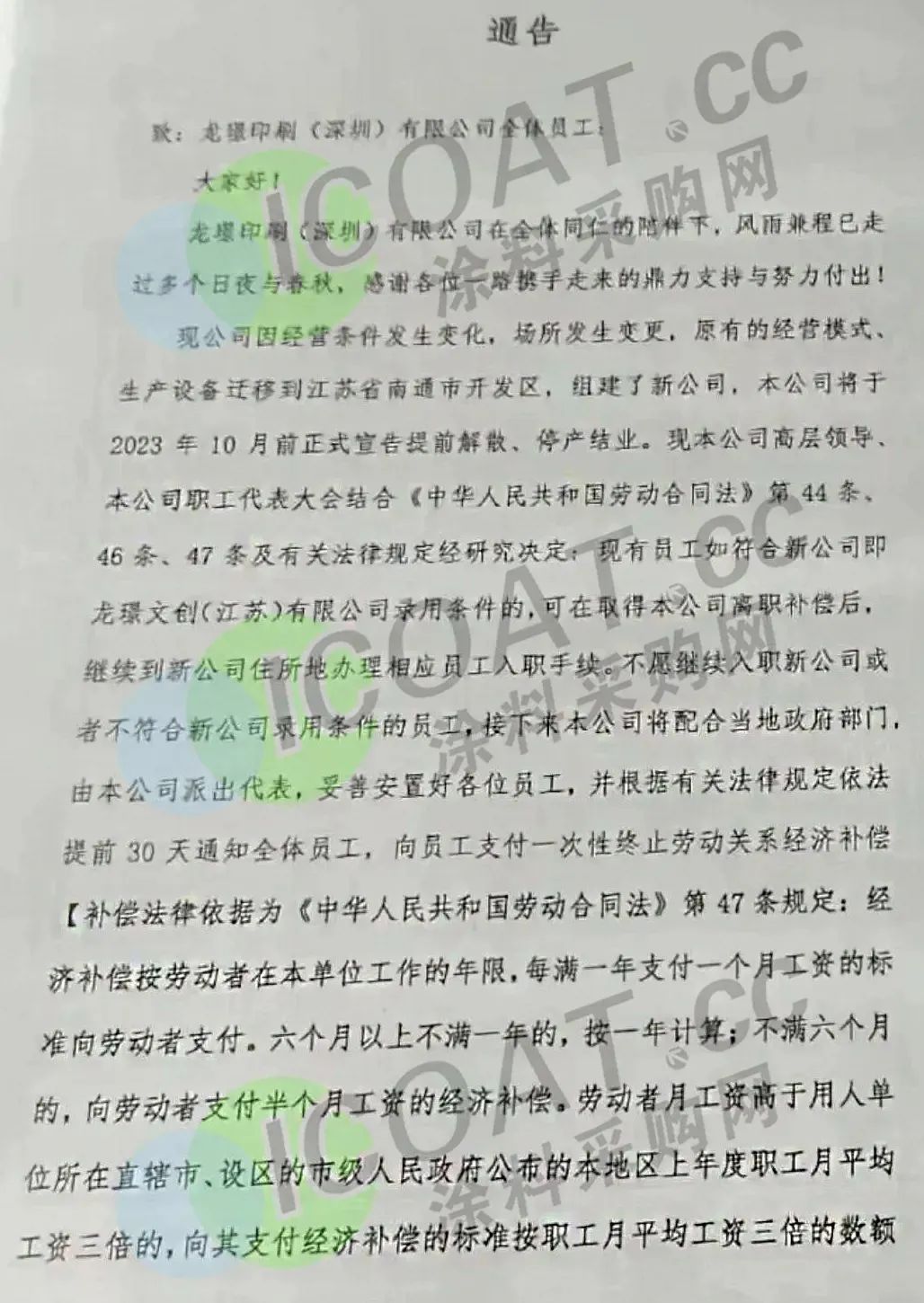 发布通知,称受大环境影响,今年整体订单持续减少,经营亏损严重,难以为继,