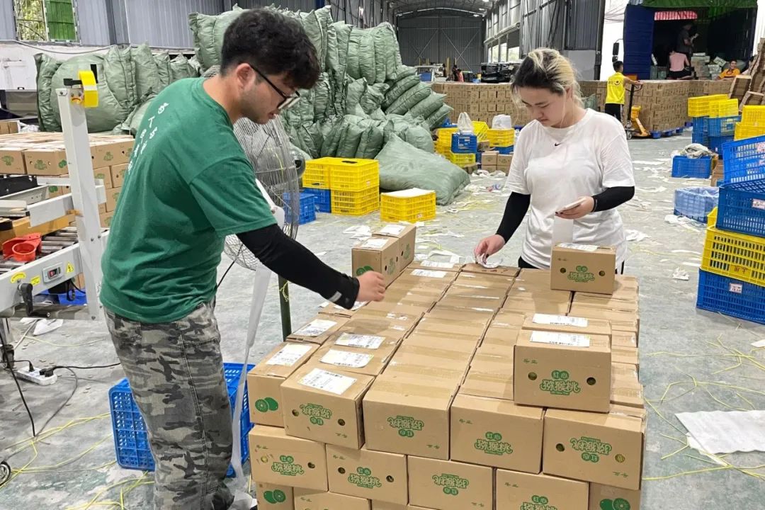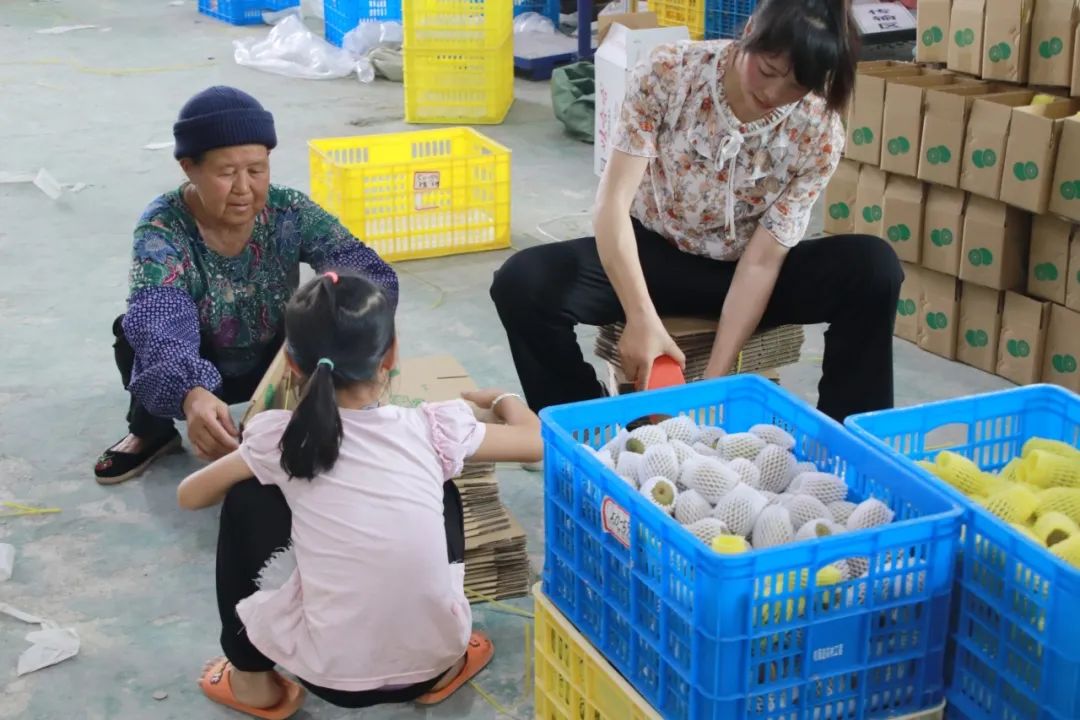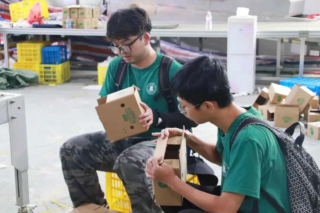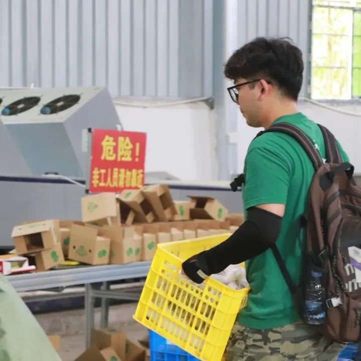 在结束参观任务后,团队队员纷纷参与到猕猴桃分拣和包装生产工作中去。从脱袋到机械洗刷分拣,再到人工分拣、折盒、装箱、贴单和发货,队员们参与到每一个环节中,和公司工人一起完成了近十个小时的工作。通过实践过程中与工人的沟通交流,队员们发现在职工人大多数是中年女性,且都是忙完家里的农活后到厂里兼职,趁着每年这一个月的采收季挣钱补贴家用,其余的一些暑期临时工都为初高中生。令队员印象深刻的是其中一个不到五六岁的小女孩,与她一起的是她母亲和年近九十的奶奶,虽然年纪不大,但是工作熟练程度却远远超过她这个年纪的水准。