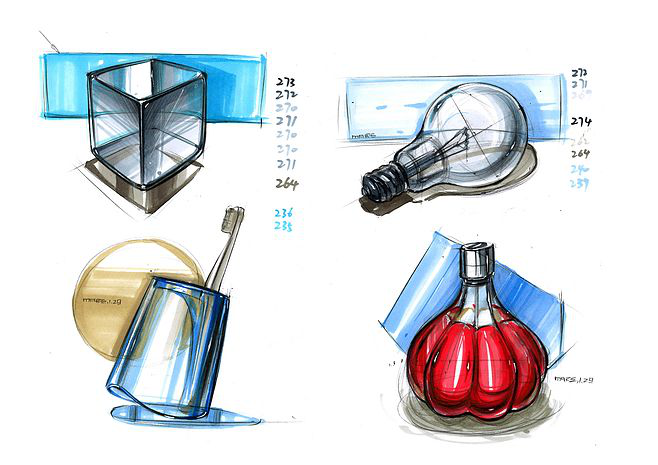 产品线稿训练、马克笔上色、制作泡沫塑料模型…