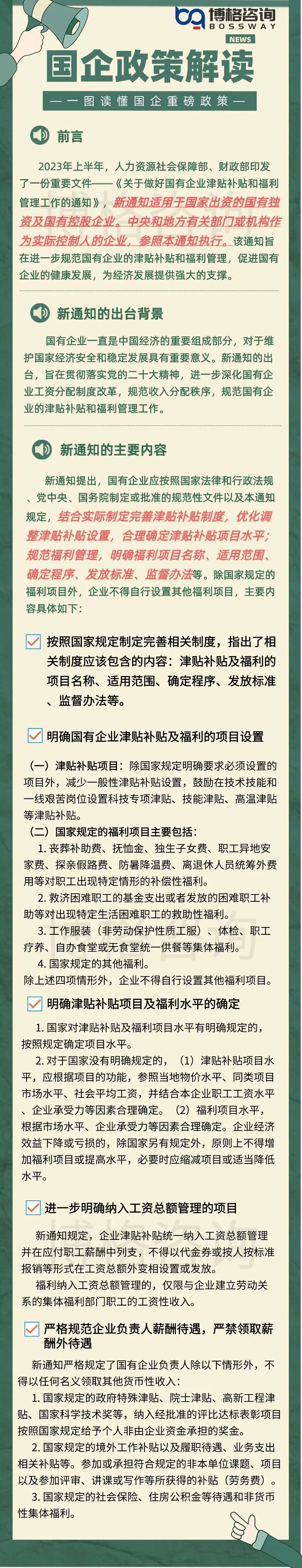该文件规定除福利费范围缩小外,还发生了哪些其他新变化?职工因公外地就医费用、职工供养直系亲属医疗补贴和供暖费补贴,不再属于福利费。推进货币化福利改革,将取暖费(即供暖补贴)等按人按标准定期发放的货币化福利纳入工资总额管理。财企〔2009〕242号列举的福利费范围中没有工作服,实务中,对于劳动保护性质工服计入了劳动保护费用。那么,对于企业员工上班工作时统一着装的非劳动保护性质工服费用是否计入福利费,存在一定争议。争议原因,税务文件《国家税务总局关于企业所得税若干问题的公告》(国家税务总局公告2011年第34号)规定,企业员工上班工作时统一着装非劳动保护性质工服费用,可以作为企业合理的支出给予税前扣除。新文件人社部发〔2023〕13号对此做出了明确规定,工作服装(非劳动保护性质工服)费用属于福利费。财企〔2009〕242号列举的福利费范围中没有体检费,虽然实务中多数财务人员将体检费计入了福利费,但是没有明确的政策依据。然而,新文件人社部发〔2023〕13号明确规定,体检费属于福利费,因此,财务人员将企业发生的员工体检费计入福利费名正言顺啦!关于集体福利部门职工的工资是否应纳入工资总额,争议不断。新文件人社部发〔2023〕13号对此做出了明确规定:“与企业建立劳动关系的集体福利部门职工的工资性收入纳入工资总额管理。”此后,大家对此不要再有争议啦!1.企业津贴补贴统一纳入工资总额管理并在应付职工薪酬中列支,不得以代金券或按人按标准报销等形式在工资总额外变相设置或发放。2.企业不得将本企业产品和服务免费或低价提供职工使用,确实需要的,应按市场价格公平交易。4.工会福利、职工教育经费、社会保险及住房公积金有关费用列支按照国家相关规定管理。新通知提出,国有企业应按照国家法律和行政法规、党中央、国务院制定或批准的规范性文件以及本通知规定;结合实际制定完善津贴补贴制度,优化调整津贴补贴设置,合理确定津贴补贴项目水平;规范福利管理,明确福利项目名称、适用范围、确定程序、发放标准、监督办法等。除国家规定的福利项目外,企业不得自行设置其他福利项目,对福利项目水平国家有明确规定的,按照规定执行。第一,按照国家规定制定完善相关制度,指出了相关制度应该包含的内容:津贴补贴及福利的项目名称、适用范围、确定程序、发放标准、监督办法等。设置的项目外,减少一般性津贴补贴设置,鼓励在技术技能和一线艰苦岗位设置科技专项津贴、技能津贴、高温津贴等津贴补贴。(1)丧葬补助费、抚恤金、独生子女费、职工异地安家费、探亲假路费、防暑降温费、离退休人员统筹外费用等对职工出现特定情形的补偿性福利。(2)救济困难职工的基金支出或者发放的困难职工补助等对出现特定生活困难职工的救助性福利。(3)工作服装(非劳动保护性质工服)、体检、职工疗养、自办食堂或无食堂统一供餐等集体福利。1. 国家对津贴补贴及福利项目水平有明确规定的,按照规定确定项目水平。(1)津贴补贴项目水平,应根据项目的功能,参照当地物价水平、同类项目市场水平、社会平均工资,并结合本企业职工工资水平、企业承受力等因素合理确定。(2)福利项目水平,根据市场水平、企业承受力等因素合理确定。企业经济效益下降或亏损的,除国家另有规定外,原则上不得增加福利项目或提高水平,必要时应缩减项目或适当降低水平。新通知规定,企业津贴补贴统一纳入工资总额管理并在应付职工薪酬中列支,不得以代金券或按人按标准报销等形式在工资总额外变相设置或发放。福利纳入工资总额管理的,仅限与企业建立劳动关系的集体福利部门职工的工资性收入。第五, 严格规范企业负责人薪酬待遇,严禁领取薪酬外待遇。新通知严格规定了国有企业负责人除以下情形外,不得以任何名义领取其他货币性收入:1. 国家规定的政府特殊津贴、院士津贴、高新工程津贴、国家科学技术奖等,纳入经批准的评比达标表彰项目按照国家规定给予个人非由企业资金承担的奖金。2. 国家规定的境外工作补贴以及履职待遇、业务支出相关补贴等。参加或承担符合规定的非本单位课题、项目以及参加评审、讲课或写作等所获得的补贴(劳务费)。3. 国家规定的社会保险、住房公积金等待遇和非货币性集体福利。来源:国资动态