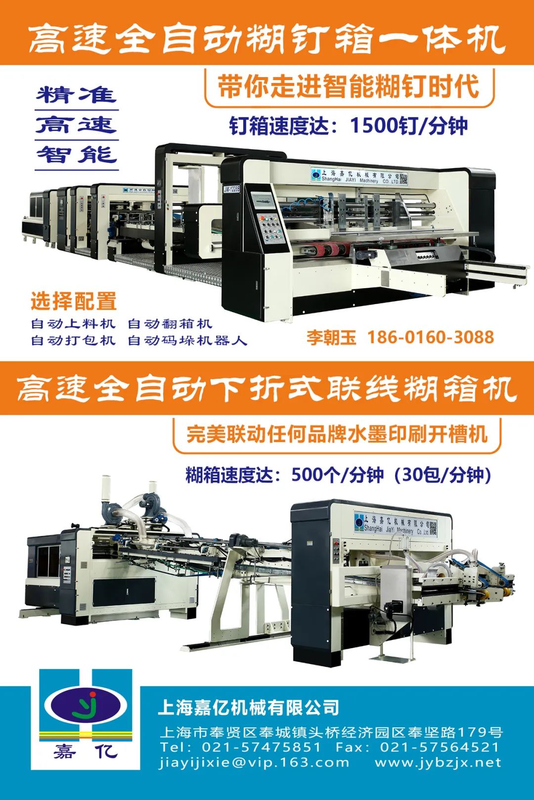 而上海嘉亿机械有限公司作为上海市高新技术企业、国内纸箱后道机械制造行业标杆企业之一,其主要人员拥有20年以上的行业经验,成功研发并推出了多款有着自主知识产权、在国际市场上领先的全自动糊/钉箱机型,产品以优质的口碑畅销海内外地区。