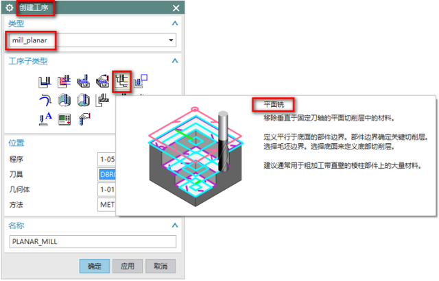 在加工界面中,【创建工序】-【mill_planar】-【平面铣】,如下图所示: