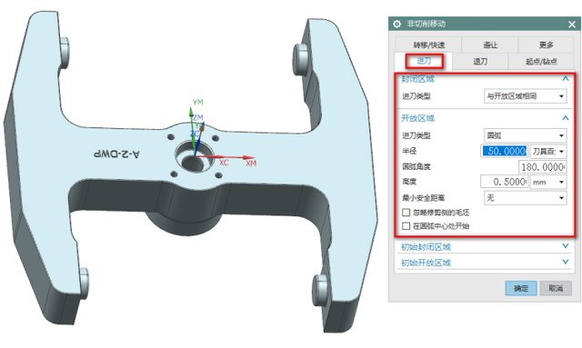 打开【非切削移动】后,【封闭区域】-【进刀类型】设置【与开放区域相同】,【开放区域】-【进刀类型】设置【圆弧】-【半径50%】-【圆弧角度180】-【高度0.5MM】,如下图所示: