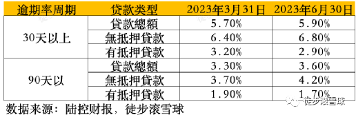 从上面表格数据中可以看出,如果将贷款按周期划分两个部分,截止6月底,贷款逾期率整体比一季度有略微上升,但有抵押的逾期率在下滑,无抵押的上升更明显一点。