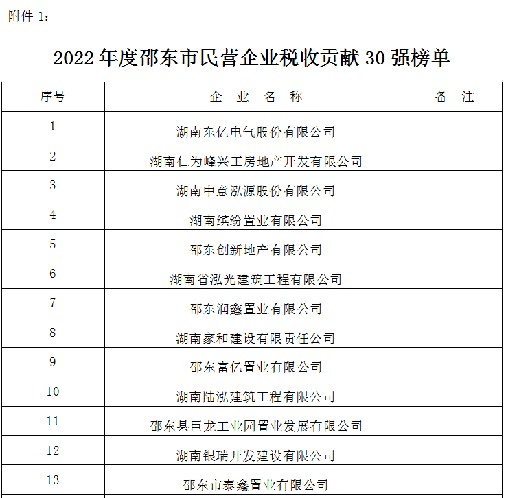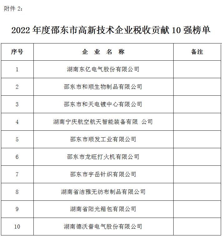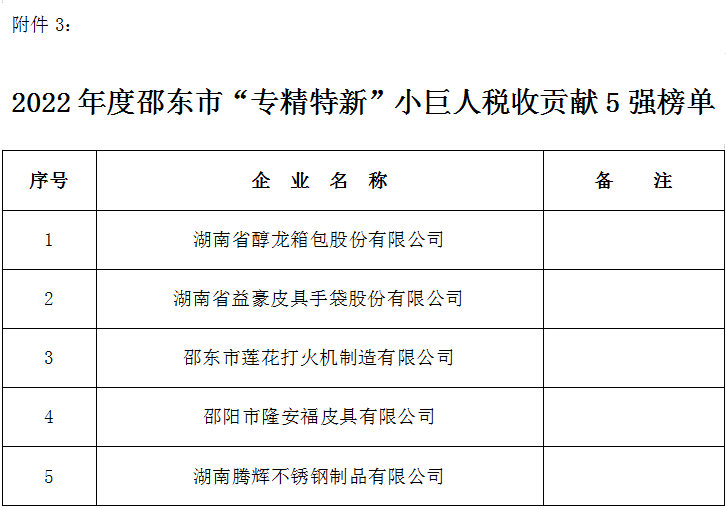 关于公布2022年度“邵东市民营企业税收贡献30强”等三张榜单的通报为营造全社会依法经营、诚信纳税的良好氛围,深入推进财源建设工程,促进我市经济高质量发展,根据市“三高四新”财源建设工程联席会议办公室《关于印发〈2023年邵东市财源建设工作要点〉的通知》(邵财源办〔2023〕1号)精神,经部门联合审查,确认了2022年度“邵东市民营企业税收贡献30强”“邵东市高新技术企业税收贡献10强”“邵东市‘专精特新’小巨人税收贡献5强”三张榜单,现予以通报。望上榜企业珍惜荣誉、再创佳绩,全市纳税人依法经营、诚信纳税,为促进邵东经济高质量发展做出贡献。2.2022年度邵东市高新技术企业税收贡献10强榜单 3.2022年度邵东市“专精特新”小巨人税收贡献5强榜单