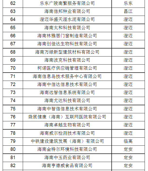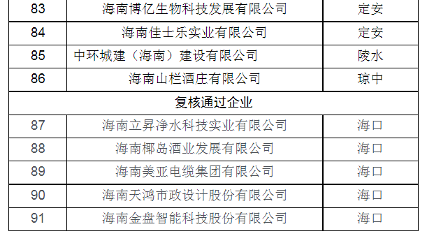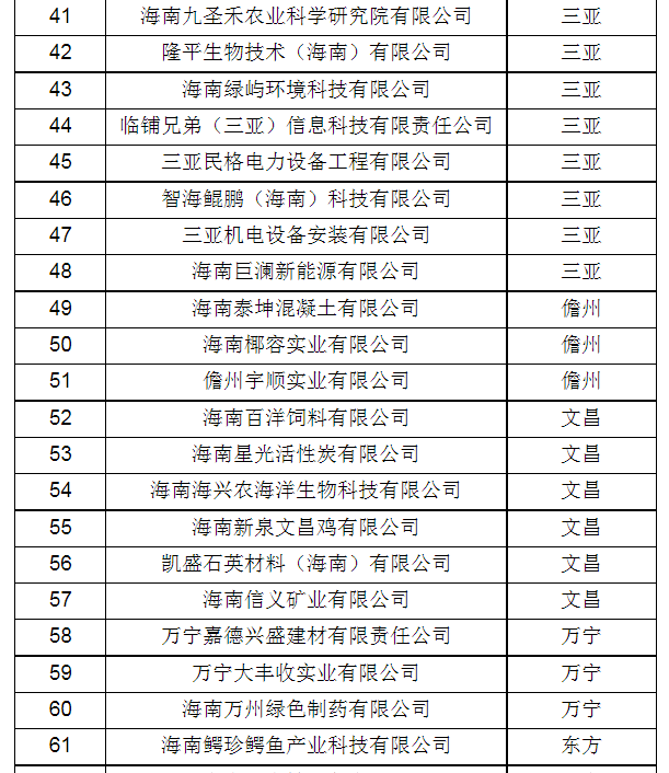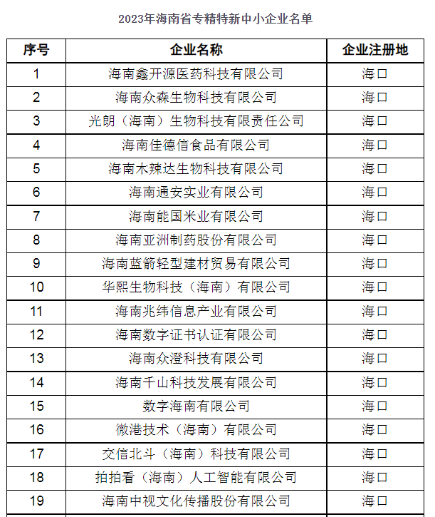中小企业名单的通告根据《海南省优质中小企业梯度培育管理实施细则》(琼工信规〔2022〕13号)相关规定和《海南省工业和信息化厅关于组织开展2023年专精特新中小企业申报工作的通知》要求,经企业自愿申报、市县中小企业主管部门初审推荐、专家审核和公示等程序,认定海南鑫开源医药科技有限公司等86家企业为2023年海南省专精特新中小企业,海南立昇净水科技实业有限公司等5家企业为2023年度通过复核的专精特新中小企业,现予以公布,本批次专精特新中小企业有效期三年(2023年5月1日至2026年4月30日)。