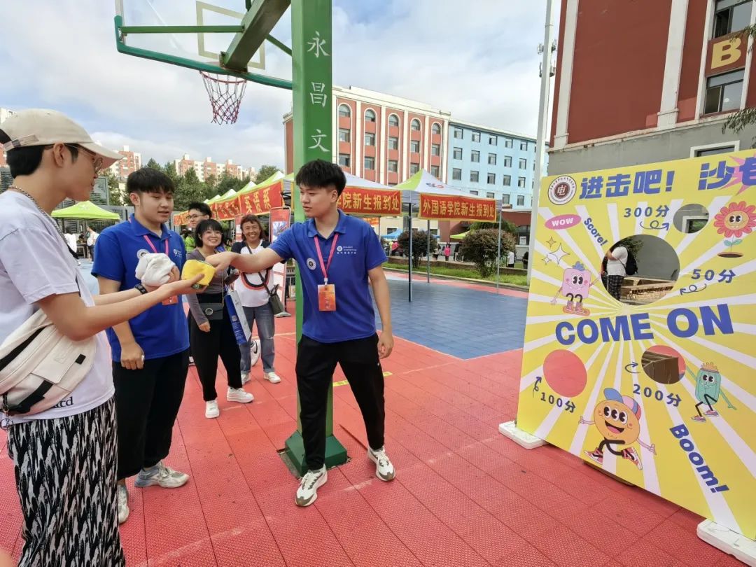 精心设计的塑料板上设置5个大小的圆孔,参与的萌新们每人手持5个沙包站在指定区域,只要成功投入3个以上沙包便可获得光华专属纪念章,精准的投射,热情的欢呼,都充分彰显了萌新们青春的色彩与光芒。