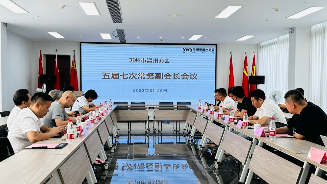 8月25日(星期五)下午,苏州市温州商会五届七次常务副会长会议在商会会议室成功召开。商会会长苏琪皓、党总支书记黄再枫、秘书长陈仁义、新生代会长徐忠强、常务副会长仇红伟、戴哲海、金晨开、李海强、陈康远、杨新展、包邦想、王池铖、邵洪和出席本次会议(部分常务副会长因公务原因未能到场参加)。