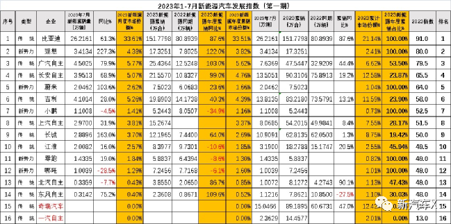 江淮新能源汽车发展指数为49.5。江淮新能源汽车能够进入到前十,也许出乎意料,但江淮踏实做事的风格,1-7月累计销量也达到8.4万辆,,自主乘用车新能源占比高达46%,推高了其新能源汽车发展指数。但江淮自主新能源同比下滑10.6%,同时中高端占比为0%,大大降低了江淮新能源汽车的发展指数。