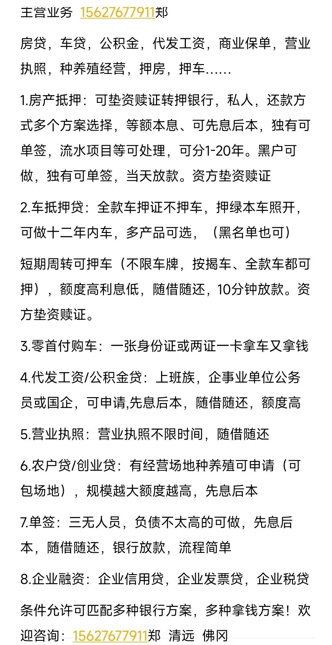 一手对接银行渠道(佛冈 英德):匹配多银行优势产品,专业操作非标抵押贷款、非标信用贷款(代发工资贷、社保贷、营业执照贷、种养殖贷、公积金贷一张身份证贷等)!可单签!三无人员多银行方案可做!额度高,先息后本,1到5年期,随借随还!实力操作!垫资过桥赎证转贷续贷一站式!为个人、企业一站式银行高额度低利息融资贷款服务 15627677911 郑生( 佛冈 英德 )10年专注银行产品贷款服务 欢迎咨询合作。