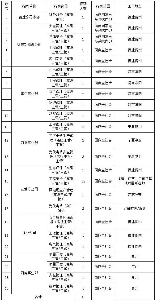 国家电投集团福建新能源有限公司(简称“福建新能源公司”)成立于2016年6月,主要负责风电、光伏、综合智慧能源等项目开发、建设、并购,投资项目分布于福建、江西、安徽、山东、河南、宁夏、贵州、内蒙古等地。目前,前期、核准、在建、投运以及并购的项目装机容量超100万千瓦。福建公司华中事业部(简称“华中事业部”)成立于2023年5月,前身是国家电投集团福建电力有限公司河南公司,立足河南、山东、河北等区域,负责项目开发、工程建设、生产运维及经营管理工作,并根据授权负责其他省份的项目前期工作。现管理4个运营项目(延津县科兴风场、郸城风场、青岛曹城山风电项目和台前县静脉产业园一体化垃圾发电项目),2个即将开工建设的光伏和风电项目。同时在河南、河北、山东储备了100万千瓦的新能源项目,公司发展前景广阔。福建公司西北事业部(简称“西北事业部”)成立于2023年5月,前身是国家电投集团福建电力有限公司宁夏公司,主要负责统筹福建公司在西北域内各省份项目发展、工程建设、运营管理工作,并根据授权负责其它省份的项目前期工作。主营新能源发电、综合智慧能源供给等业务。目前拥有光伏发电容量70万千瓦,风力发电容量5万千瓦。福建公司福州运营分公司(简称“运营分公司”)成立于2021年9月,主要履行福建区域及省外受托新能源项目的工程建设、生产运营、电力市场营销及碳排放权交易等职能。目前主要承担30余个新能源项目运营管理,积极推进国家电投在闽单位所辖新能源场站接入及运维委托管理,开展省内外户用光伏项目开发及建设工作。福州公司(福建电投能源有限公司)(简称“福州公司”)成立于2022年1月,主要负责统筹福建公司在福州及周边区域项目开发、工程建设、市场营销、生产经营工作。现有项目主要包括福清元洪投资区综合智慧能源项目一期、二期、三期工程,荣华山一期工程,平潭综合智慧能源示范项目一期工程能源站,福清服务中心能源站。另有闽侯县域一期(鸿尾)在建工程,年产能4万吨辐照项目、福清县域一期、福融福清总部一期、福融广东肇庆项目正在办理相关开工手续,储备项目80万千瓦。福建公司西南事业部(简称“西南事业部”)成立于2023年5月,主要负责统筹福建公司在西南地区及其他授权地区省份的项目发展、工程建设、生产运维及经营管理工作。主营新能源发电、综合能源供给等业务。目前拥有在建风电容量5万千瓦,在建光伏容量10万千瓦,正在开展前期新能源项目容量超过100万千瓦。根据工作需要现公开招聘相关人员,具体事项公告如下: