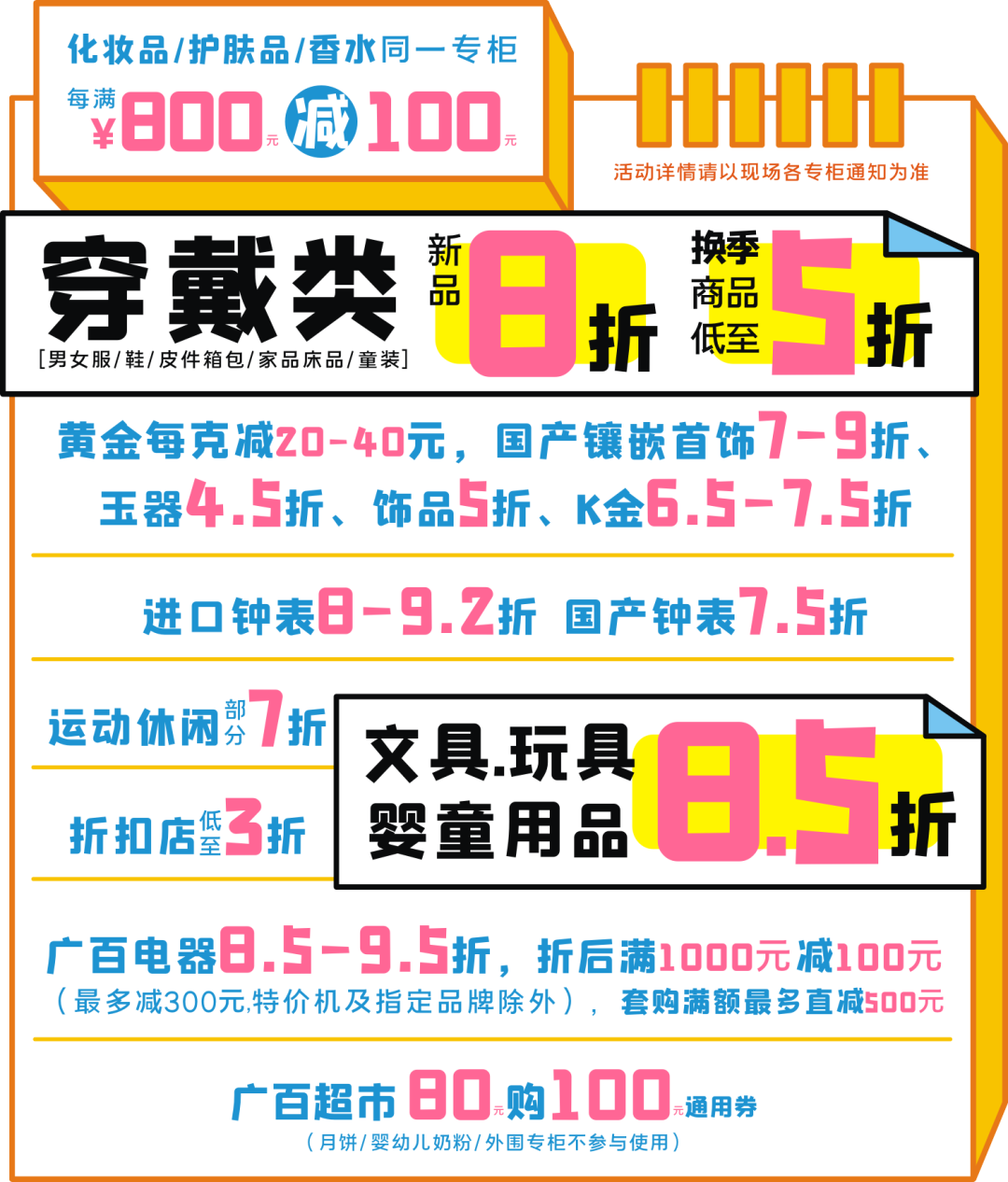 各项促销活动之间恕不重复优惠;指定商品及品牌恕不参与本次活动,恕不能同时使用促销券;会员凭会员卡参与上述活动后,部分恕不重复享受会员系列卡折扣优惠,反之亦然;各类租户消费、券类消费、银行促销、各类积分兑礼及支付、购广百积分卡等均恕不获赠广百会员积分;广州市广百股份有限公司北京路分公司对本次活动拥有法律允许范围内的解释权。